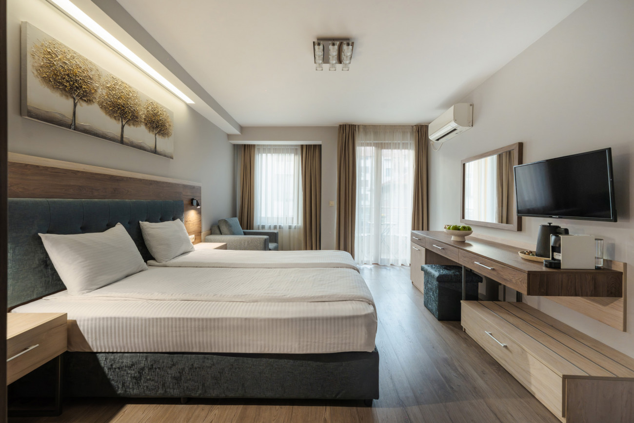 Double room from guest house "Velik" offers warmth, luxury and comfort. In addition to a large bed and comfortable armchair, the room offers free WIFI access and a flat-screen TV. At your disposal you will find a well-stocked mini-bar with chilled drinks and snack foods. Each of the rooms has its own balcony and a bathroom with the necessary toiletries for your complete convenience. The rooms offer a workplace where you can combine your work commitments with a comfortable stay with us