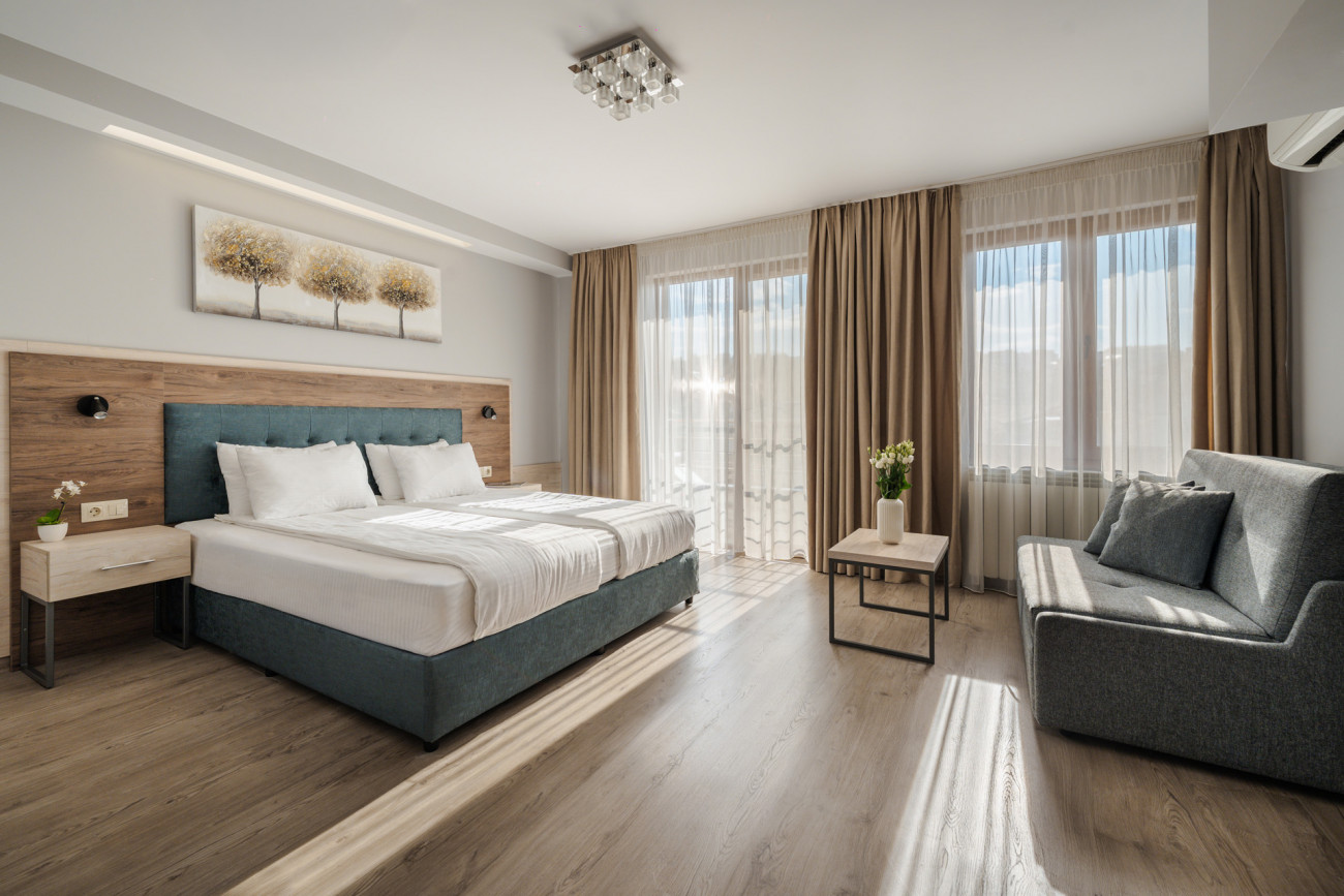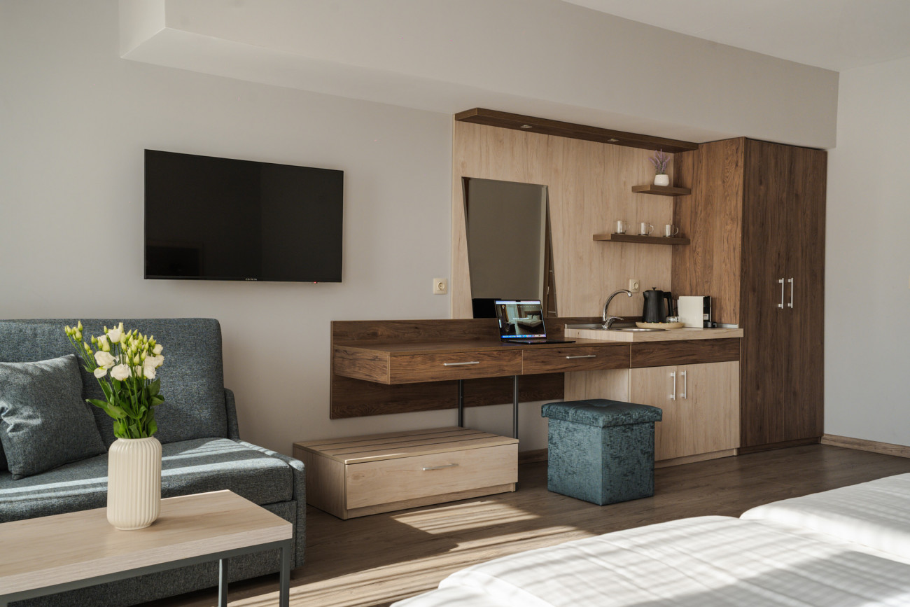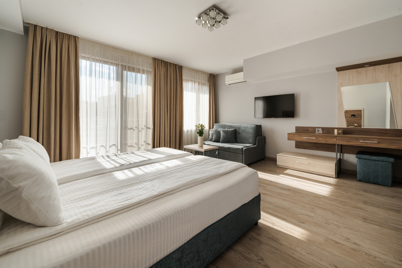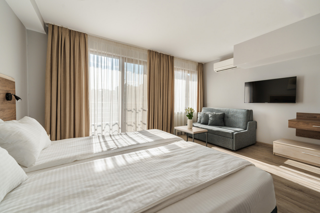 Тройна стая от къща за гости "Велик" , предлага топлота, простор и комфорт. Освен голямо легло и удобен разтегателен диван, стаята предлага безплатен достъп до WIFI и телевизор с плосък екран. На ваше разположение ще откриете добре зареден мини-бар с охладени напитки и храни от категория снак. Всяка от стаите разполага със собствен балкон, както и санитарен възел с необходимите към него тоалетни принадлежности за вашето пълно удобство. Стаите предлагат работно място, където може да съчетавате работните си ангажименти с комфортен престой при нас.